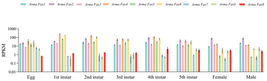 Transcriptomic sequencing and gene expression analysis of ArmaFas1–9 revealed that these genes were expressed in different developmental stages of A. chinensis, with varying expression levels in each stage (Figure 5). In particular, the expression level of ArmaFas9 exhibited an increasing trend, ultimately stabilizing in the adult stage.