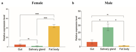 Expression profiles of ArmaFas9 in different tissues of Arma chinensis. (a,b) qRT-PCR analysis of the expression profiles of ArmaFas9 in different tissues of female and male Arma chinensis adults, respectively. Different tissues are indicated with different colors, and the expression levels are presented on the y-axis. Data were analyzed using two-tailed Student’s t-tests (n = 3, mean ± SE; ns: p > 0.05, * p < 0.05, *** p < 0.001). ns: no significance.
