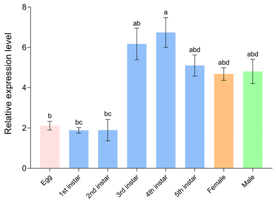qRT-PCR analysis of ArmaFas9 expression profiles at different instar nymph stages and adults of Arma chinensis. Expression levels are presented on the y-axis. Data represent the mean relative expression levels ± SE. Data were analyzed using one-way analysis of variance (p < 0.05) with the Waller–Duncan post hoc test (n = 3). Different letters on error bars indicate significant differences.