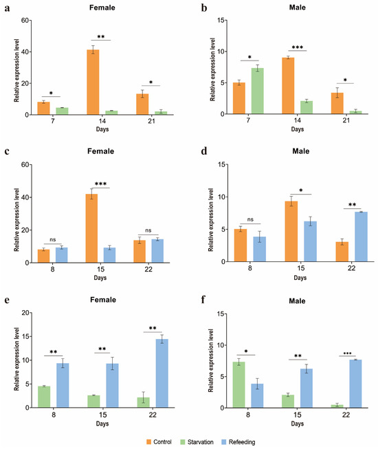 qRT-PCR analysis of the relative expression of ArmaFas9 under different treatments on different days. (a,b) Expression of ArmaFas9 in the starvation and control groups. (c,d) Expression of ArmaFas9 in the control and refeeding groups. (e,f) Expression of ArmaFas9 in the starvation and repeated refeeding groups. Data are the relative mean expression levels ± SE. Data were analyzed using two-tailed Student’s t-tests (n = 3, mean ± SE; ns: p > 0.05, * p < 0.05, ** p < 0.01, *** p < 0.001). ns: no significance.