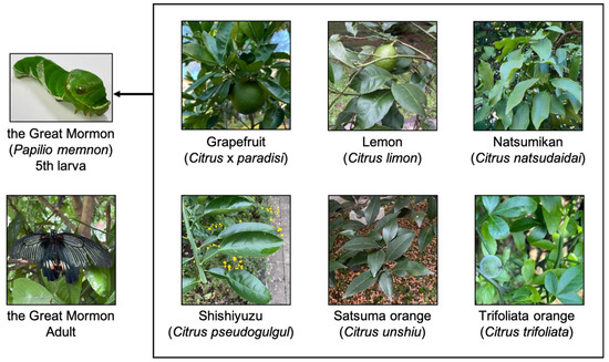 P. memnon larvae were obtained at the Fuchu campus in the Tokyo University of Agriculture and Technology. The larvae were maintained with the following fresh leaves: Natsumikan, Grapefruit, Lemon, Shishiyuzu, Satsuma orange, or Trifoliata orange at 25 °C under 16 h light/8 h dark cycle. The fresh leaves were obtained at the Fuchu campus in the Tokyo University of Agriculture and Technology.