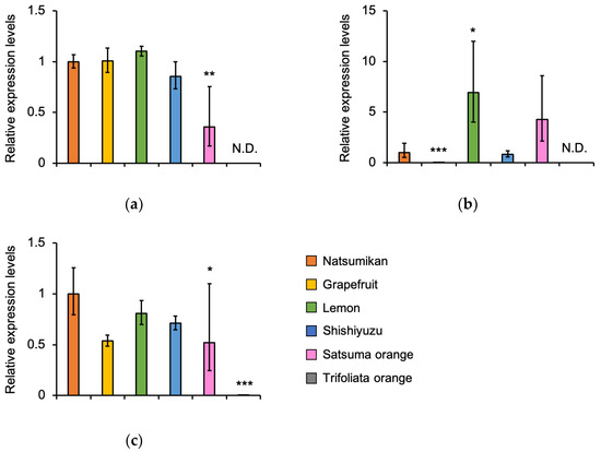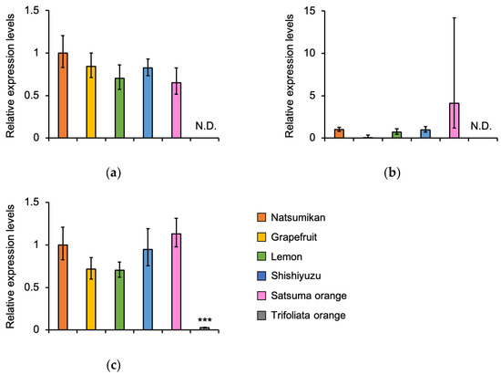 Comparison of CYP’s expression in the midgut from P. memnon larvae fed on six kinds of Citrus plants (Natsumikan, Grapefruit, Lemon, Shishiyuzu, Satsuma orange, and Trifoliata orange) using RT-qPCR. Relative expression levels mean RQ. Bars show RQ minimum and RQ maximum. N.D. means not detected. *** p < 0.001, ** p < 0.01, * p < 0.05, compared with the Natsumikan-fed larval group using Dunnett’s test. (a) CYP6B2 (n = 3), (b) CYP6B5 (n = 3), and (c) CYP6B6 (n = 3).
