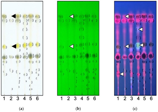 Comparison of components included in chloroform extracts from larval frass by TLC under white light (a), UVC at 256 nm (b), and UVA at 366 nm (c). The marks on the leftside show spots detected by UVC, and those on the rightside show spots detected by UVA. Grapefruit (lane 1), Trifoliata orange (lane 2), Natsumikan (lane 3), Satsuma orange (lane 4), Shishiyuzu (lane 5), and Lemon (lane 6) were used as larval host plants. Black and white arrowheads show the specific spots detected or non-detected in the six types of larval frass.