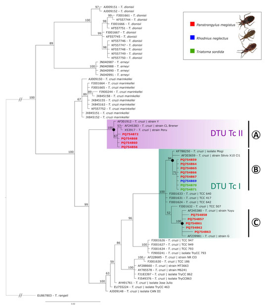 Bayesian phylogeny based on the partial 18S ribosomal RNA sequences of Trypanosoma species (alignment of 758 bp). Trypanosoma rangeli was used as an outgroup. Support values on nodes (in percentage) indicate posterior probabilities (PPs). Sequences obtained in this study are indicated according to the hosts: Panstrongylus megistus (red), Rhodnius neglectus (blue), and Triatoma sordida (green). DTU TcII (A) and DTU TcI (B,C) clades are shown.