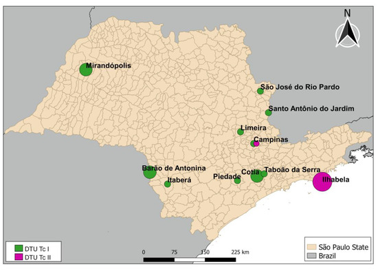 Despite the limitations of this study, including its dependence on successful collections or the sending of insects by the population for identification or examination, we were able to demonstrate that DTU TcI is the most common lineage that infects triatomine species in São Paulo State (76%), with 24% belonging to DTU TcII. In this sense, knowing the diversity of T. cruzi lineages becomes relevant for public health since genetic subpopulations can influence the clinical evolution of ChD [34]. DTU TcI is the most common in Central America and northern South America, often associated with less severe forms of the disease, while DTU TcII is associated with severe cardiac manifestations in countries of the Southern Cone [35]. Another relevant factor concerns the response to antiparasitic treatment, which is distinctly dependent on the lineage [36].