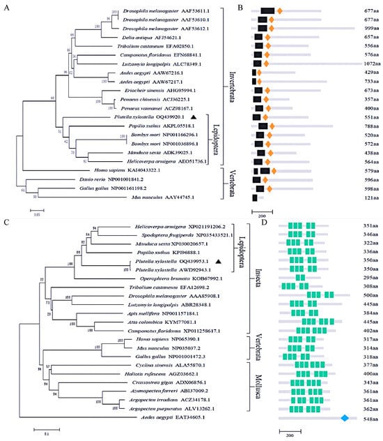 Phylogenetic analysis of NF-κB and IκB factors in different species. (A) Phylogenetic tree of NF-κB factors in different species, and PxDorsal is specifically marked with ▲; (B) NF-κB factors domain in different species; RHD domain is represented by black boxes and the orange diamond boxes represent IPT domain; (C) Phylogenetic tree of IκB factors of different species, and PxCactus is indicated with ▲; (D) IκB inhibitors domain of different species; the green boxes represent the ANKs domain, and the CactinC domain is represented by a blue diamond box.