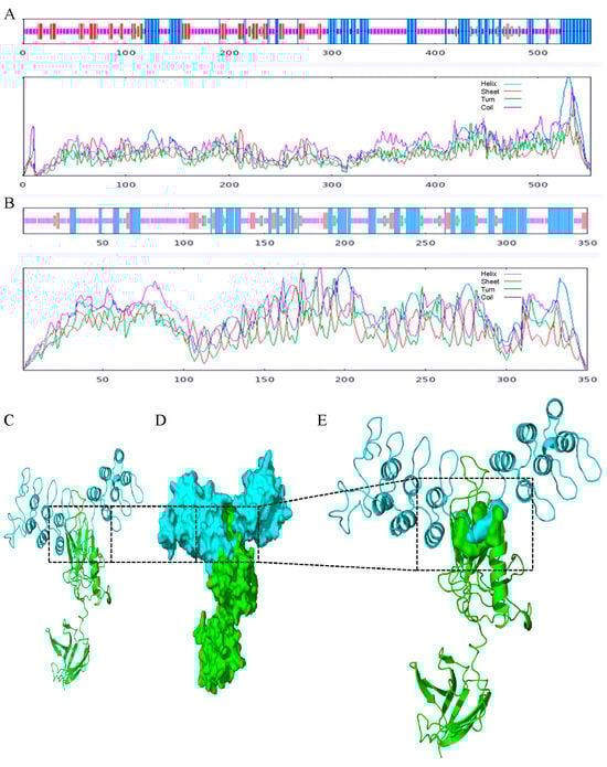 SOMPA (https://npsa-pbil.ibcp.fr/cgi-bin/npsa_automat.pl?page=npsa_sopma.html; accessed on 10 December 2022) was used to analyze the protein secondary structure, using the SWISS-MODEL (https://swissmodel.expasy.org/; accessed on 16 March 2023) to construct the protein 3-dimention model, and the homology model was evaluated by the PROCHECK test using UCLA-DOE LAB-SAVES (https://saves.mbi.ucla.edu/; accessed on 16 March 2023). Molecular docking was performed using the protein–protein docking (Piper) module in Schrödinger. The standard docking protocol was selected, with the number of rotatable bonds of the ligand set to the default maximum and the number of generated conformational states defined as 10. Following docking, energy minimization was performed to refine the interactions and ensure that a comprehensive conformational ensemble of the ligand was captured. The first-ranked conformation was selected for visualization with PyMOL.