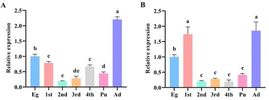 The eggs of P. xylostella (each tube covered the bottom of a 1.5 mL centrifuge tube), were collected alongside 30 1st instar larvae, 20 2nd instar larvae, 10 3rd instar larvae, 5 4th instar larvae, 5 pupae, and 5 adults, and 3 tubes were collected each instar. Then, we extracted the RNA from all the samples, respectively, and reverse transcribed it into cDNA, and stored it at −20 °C for later use.