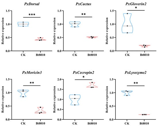 Effects of feeding Bt8010 on the expression of immune genes in P. xylostella. When P. xylostella fed with Bt8010, the expression of immune genes PxDorsal and PxCactus and antimicrobial peptides PxGloverin2, PxMoricin3, and PxLysozyme2 were significantly down-regulated; however, the expression of PxCecropin2 was up-regulated. The data represented the mean ± SEM (n = 3). Student’s t test analysis, * p < 0.05, ** p < 0.01, and *** p < 0.001.