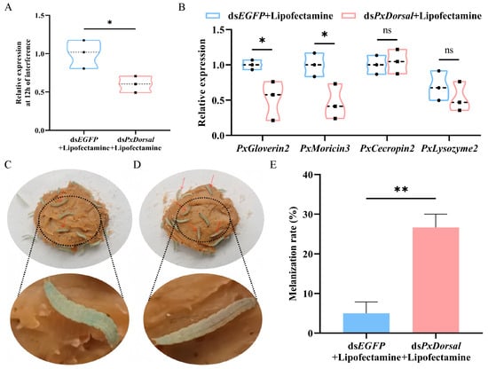 In order to select the optimal interference efficiency, we chose to quantify 900 ng of dsRNA (dsPxDorsal/dsEGFP), 1500 ng of dsRNA (dsPxDorsal/dsEGFP), and 900 ng of dsRNA (dsPxDorsal/dsEGFP + Lipofectamine), three groups injected into the 4th instar larvae of P. xylostella, and the results indicated that the target gene PxDorsal was significantly silenced after the injection of 1500 ng of dsPxDorsal (t = 4.563, df = 4, p = 0.01) and 900 ng of dsPxDorsal + Lipofectamine (t = 3.705, df = 4, p = 0.021) for 12 h (Figure 5A and Figure S1H). Since a high concentration of dsRNA may affect the growth and survival of P. xylostella, and dsRNA mixed with Lipofectamine can improve the interference efficiency, we subsequently chose to conduct the experiment by injecting 900 ng of dsRNA + Lipofectamine. Following the silencing of the PxDorsal gene, the expression of PxGloverin2 (t = 2.916, df = 4, p = 0.043) and PxMoricin3 (t = 2.828, df = 4, p = 0.047) were significantly down-regulated compared to the control group (dsEGFP), while no significant differences were observed in the expression of PxCecropin2 (t = −1.055, df = 4, p = 0.351) and PxLysozyme2 (t = 0.973, df = 4, p = 0.386) (Figure 5B). Subsequently, a morphological observation experiment showed that PxDorsal was silenced and simultaneously feeding Bt8010, and the melanization of the larvae epidermis was observed after 12 h (Figure 5C,D). Further statistical analysis revealed that the melanization rate in these larvae was significantly higher than the control group (t = −5.50, df = 4, p = 0.005) (Figure 5E). These findings suggest that PxDorsal regulates antimicrobial peptide expression in P. xylostella, playing a key role in immune response modulation during pathogen infection.