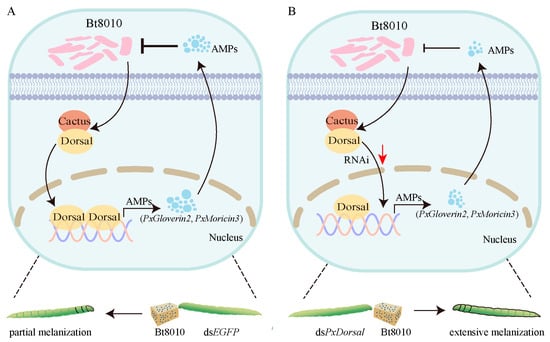 Model of NF-κB pathway regulating Bt susceptibility in Plutella xylostella. (A) PxDorsal and PxCactus interactively regulate the antimicrobial peptides PxGloverin2 and PxMoricin3 in P. xylostella, thereby inhibiting the proliferation of Bt and resulting in the phenomenon of partial epidermis melanization; (B) due to the down-regulation of the expression of PxDorsal, the expression of PxGloverin2 and PxMoricin3 were down-regulated, which increases the susceptibility of P. xylostella to Bt and causes an accelerated melanization of the epidermis.