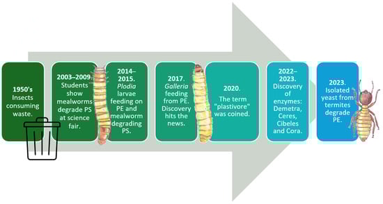 However, the first scientific report suggesting the revolutionizing idea of using insects to fight plastic pollution did not come until 2014 using the larvae Plodia interpunctella [8,9]. In this study, scientists observed P. interpunctella chewing and eating PE films; they then proceeded to isolate the first gut PE-degrading strains Enterobacter asburiae YT1 and Bacillus sp. YP1. This report was followed by the first report of full PS mineralization into CO2 by T. molitor larvae [10] and the first observation of the waxworm (Galleria mellonella’s larvae) degrading PE in 2017 [11]. In the same year, this discovery hit the news and was published in National Geographic to reach the general public, where Dr. Federica Bertocchini was acknowledged as the discoverer [12]. Later in 2022, she and her research group in Spain identified four novel waxworm saliva enzymes responsible for this degradation and named them Demetra, Cibeles, Ceres, and Cora, which are the first plastic-degrading enzymes ever isolated from an invertebrate organism [13,14]. Some other relevant events also include the introduction of the term “plastivore” to describe insect larvae or any other organism capable of using plastic as carbon feedstock [15] and the report of plastic-degrading yeasts from adult termite guts [16]. All these important events are illustrated in Figure 1 in chronological order.