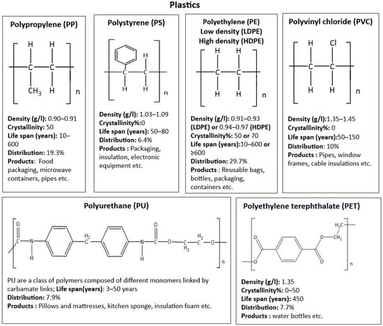 Structure, density, crystallinity, life span, and common uses of most abundant plastic resins [24,25,27].