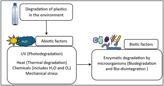 The degradation of plastics takes place because of abiotic and biotic factors present in the environment. It is also common to observe both the factors contributing consecutively when, for example, a photodegraded bottle is attacked by microbes, as shown in Figure 3 [47]. Plastic is considered as being degraded by abiotic factors when there is any change that may cause depolymerization, a change in its physical properties, the alteration of its chemical composition, mass loss, or complete mineralization into carbon dioxide and water [48,49]. When biotic degradation results in fragments or microplastics, this process is considered the bio-disintegration of the plastic, whereas if the plastic is entirely assimilated and mineralized inside the cell, it is considered biodegradation [34].