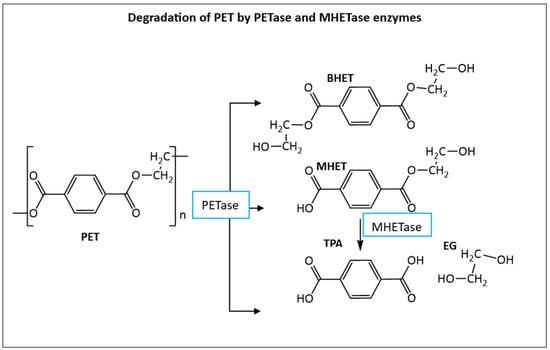 One of the most relevant events with regard to the microbial degradation of plastics is the discovery of a new bacterium species, Ideonella sakaiensis, in 2016 outside a bottle-recycling facility in Japan [52]. This bacterium breaks down PET using two novel enzymes. The first one was labelled as PETase (NCBI accession number A0A0K8P6T7.1) and converts PET to Bis(2-Hydroxyethyl) terephthalate (BHET), TPA, and mono(2-hydroxyethyl) terephthalic acid (MHET), which, in turn, is converted into more terephthalic acid (TPA) and ethylene glycol (EG) monomers by the MHETase enzyme [53] (NCBI accession number A0A0K8P8E7.1), as shown in Figure 4. After this discovery, dozens of other new PETases have also been identified from several other bacteria. Some examples are as follows: Vibrio gazogenes, Oleispira antarctica, Polyangium brachysporum [54], Marinobacter sp. [55], Ketobacter sp., and Thermobifida [56].