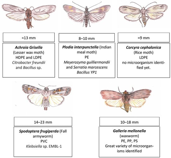 Insects from the order Lepidoptera, whose larvae have been reported to have plastic-degrading capabilities. Achroia Grisella [81,82], Plodia interpunctella [8,9,83], Corcyra cephalonica [84], Spodoptera frugiperda [85], and Galleria mellonella [11,86]. The body length of an adult is indicated, as well as the larvae’s common name, the plastic degraded, and the microorganism associated with it.