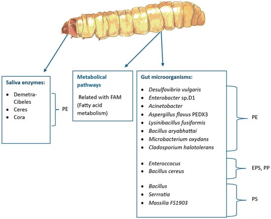 Aditionally, up, other microorganisms from this worm have been studied and proven to be capable of acting on other plastics different from polyethylene (PE). For example, Bacillus cereus can degrade polypropylene (PP) in vitro [102], while the mastication of expanded polystyrene (EPS) and polypropylene (PP) increase the abundance of Enterococcus sp. in the gut [91]. Also, the genera Bacillus and Serratia and the bacterium identified as Massilia sp. FS1903 have been associated with polystyrene (PS) degradation [30,103]. Some enzymes, pathways, and gut microorganisms mentioned in this section used by waxworms to degrade plastic are summarized in Figure 6 and Figure 7.