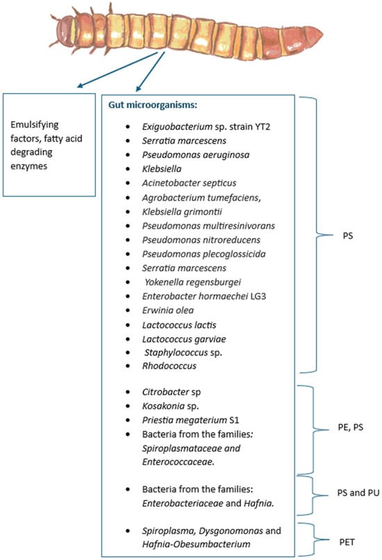 The mealworm’s gut bacterium, Exiguobacterium sp. strain YT2, degrades polystyrene (PS) [130]. Citrobacter sp. and Kosakonia sp. were also found in the gut and strongly relate with PE and PS consumption [127], as well as the bacterium Priestia megaterium S1 [152]. The other strains related to PS degradation include Erwinia olea, Lactococcus lactis, Lactococcus garviae [137], Serratia marcescens, Pseudomonas aeruginosa, Acinetobacter septicus, Agrobacterium tumefaciens, Klebsiella grimontii, Pseudomonas multiresinivorans, Pseudomonas nitroreducens, Pseudomonas plecoglossicida, and Yokenella regensburgei [117,126,128,153]. Bacteria from the family Enterobacteriaceae, such as Enterobacter hormaechei LG3 [154], and the families Spiroplasmataceae, Enterococcaceae [129,132], Staphylococcus, and Rhodococcus [135] also play a role in PS degradation. It is important to note that a study where mealworms from three different regions in China were compared showed that the larvae from different regions have different metabolisms [155], which suggests that the gut microbiota can change depending on the environment of the larvae, diet, and even depending on the PS molecular weight provided [156], yet PS consumption is ubiquitous to this species [157].