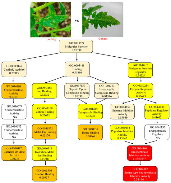 Top enrichment of DEGs in leaves of Solanum lycopersicum infested with Tuta absoluta. Enrichment was performed on each GO term under the molecular function, with the most significant nodes. Each box provides a description of the content and enrichment significance value of the GO term. Different colors represent different enrichment significance and the darker the color, the higher the significance.