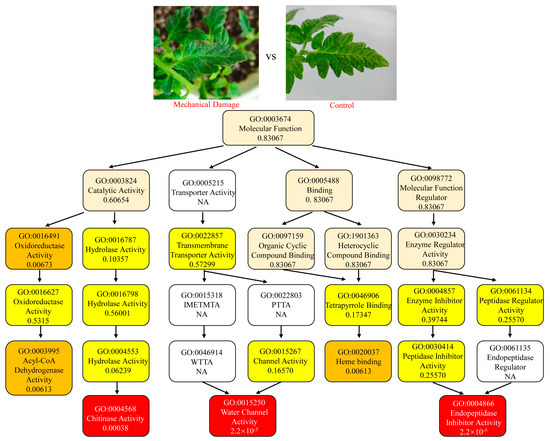 Top enrichment of DEGs in leaves of Solanum lycopersicum with mechanical damage. Enrichment was performed on each GO term under the molecular function, with the most significant nodes. Each box provides a description of the content and enrichment significance value of the GO term. Different colors represent different enrichment significance and the darker the color, the higher the significance.