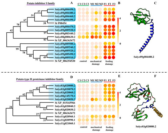 Molecular and expression information of potato inhibitor family genes. (A,D) Evolutionary tree of protein sequences of genes belonging to the potato inhibitor I (A) and potato type II proteinase inhibitor families (D). Genes specifically expressed in the feeding group are marked in blue. St P08454, St XP_006363672, St XP_006354530, St XP_015165966, and St XP_006363672 are genes of Solanum tuberosum. (B,E) Expression response of the potato inhibitor I family (B) and potato type II proteinase inhibitor family gene (E) to mechanical damage and Tuta absoluta feeding. The expression data are based on Log10 (FPKM) of each treatment. (C,F) Protein structure of important response genes from the potato inhibitor I (C) and potato type II proteinase inhibitor families (F).