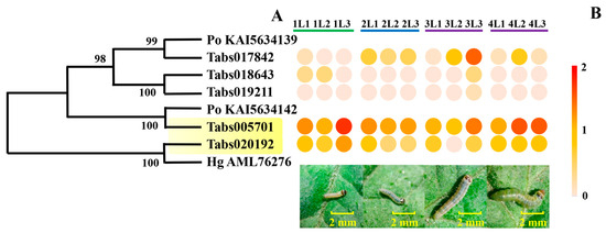 Molecular and expression information of cysteine peptidase genes during larvae development of Tuta absoluta. (A) Evolutionary tree of protein sequences of the cysteine peptidase genes. (B) Expression response of the cysteine peptidase genes during larvae development of Tuta absoluta. The expression data are based on Log10 (FPKM) of each treatment. Genes with high expression levels during all the developmental stages are marked in yellow. Po KAI5634139 and Po KAI5634142 are cysteine peptidase genes of Phthorimaea operculella. Hg AML76276 is a gene of Helicoverpa armigera.