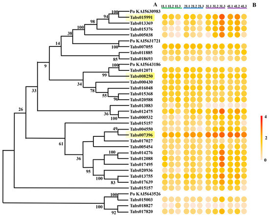 Molecular and expression information of serine protease genes during the larvae development of Tuta absoluta. (A) Evolutionary tree of protein sequences of serine protease genes. Po KAI5630983, Po KAI5631721, KAI5643186, and KAI5643526 are serine peptidase genes of Phthorimaea operculella. Genes with high expression levels during all the developmental stages are marked in yellow. (B) Expression response of serine protease genes during larvae development of Tuta absoluta. The expression data are based on Log10 (FPKM) of each treatment.