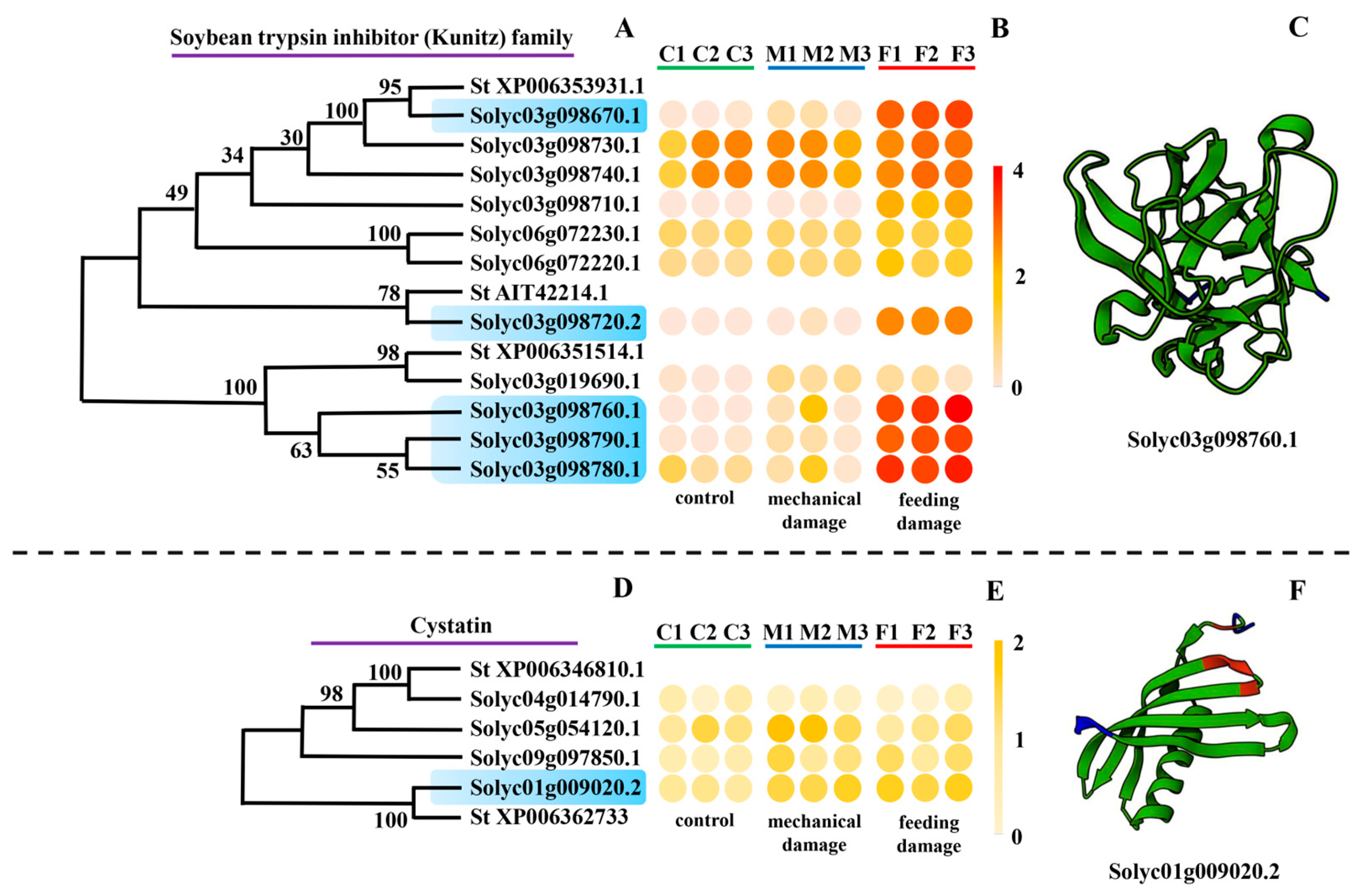 Molecular and expression information of the soybean trypsin inhibitor (Kunitz) family and aspartic acid proteinase inhibitor genes. (A,D) Evolutionary tree of protein sequences of genes belonging to the soybean trypsin inhibitor (Kunitz) (A) and cystatin families (D). Genes specifically expressed in the feeding group are marked in blue. St XP006353931.1, St AIT42214.1, St XP006351514.1, St XP006346810.1, and St XP006362733 are genes of Solanum tuberosum. (B,E) Expression response of the soybean trypsin inhibitor (Kunitz) family (B) and cystatin family genes (E) to mechanical damage and Tuta absoluta feeding. The expression data are based on Log10 (FPKM) of each treatment. (C,F) Protein structure of important response genes from the soybean trypsin inhibitor (Kunitz) (C) and cystatin families (F).