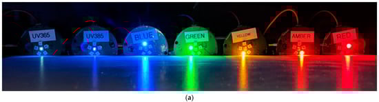 Programmable LED arrays (Figure 1a; fabrication files and other details shared through the Supplementary Materials) were built around the ATMEGA328P microcontroller (Microchip Technology, Chandler, AZ, USA) clocked with the internal 8 MHz oscillator and powered by a 3.3 V switching regulator (TPS63031, Texas Instruments, Dallas, TX, USA) from a single-cell LiPO battery charged through a linear lithium battery charging chip (MCP73831, Microchip Technology). An array of 6 LEDs (UV, blue, green, yellow, amber, and red) were each independently controllable through separate PWM outputs gating individual linear LED drivers (AS1102-T, ams-OSRAM USA, Wilmington, MA, USA), nominally set to output 84 mA when on. LED currents were sourced from switching regulators, one nominally outputting 5.5 V (TPS63060, Texas Instruments) to overcome the higher forward voltages for the UV, blue, and green LEDs, with the remaining LEDs powered from the 3.3 V used for the microcontroller. Two variants of the device were made with slightly different UV LEDs (365 nm or 385 nm; LTPL-C034UVH series, Lite-On Inc., Milpitas, CA, USA), while the same series of “visible” color LEDs were used for blue, yellow, amber, and red illumination in each device (OVS5M Series, “blue”/460 nm, “yellow”/585 nm, “amber”/610 nm, and “red”/620 nm, TT Electronics/Optek Technology, Woking, UK). Green LEDs were sourced from a different manufacturer (L135-G525003500000/530 nm, Lumileds, San Jose, CA, USA) due to non-availability of the green variant of the Optek LED when the devices were manufactured. To facilitate wireless field programming to set parameters such as selecting which LED(s) to operate under which modulation scheme and durations of operation, a serial Bluetooth module (RN42, Microchip Technologies Inc.) connected to the microcontroller can physically be powered through a jumper from the 3.3 V regulator. A spring-loaded terminal was included to plug in a 33 kΩ nominal photoconductive cell (PDV-P8103, Advanced Photonix, Inc, Ann Arbor, MI, USA) to roughly distinguish day from night by measuring the 3.3 V from a digital output divided between the photocell and a 27 kΩ resistor. For the field trials described here for CRB, we 3D-printed custom enclosures for the lighting devices, using thin-walled “glow in the dark” ping pong balls (Kolorae Brand, Blueoco, Grandville, MI, USA) cut into hemispheres glued around large orifices below the LEDs to act as an omnidirectional light diffuser (Figure 1b). Recorded spectra for each LED (test setup shown in Supplementary Materials Figure S1) with and without the diffuser is shared in the Supplementary Materials (Figure S2; Table S1), with results conforming to the well-known “green gap” where LEDs in the mid-visible wavelengths are prone to lower quantum efficiencies than blue and red LEDs [40,41]. The data also illustrate that the diffuser did not appreciably alter the spectra of light from any LED and that it was effective at scattering light so that the device could be seen from any side (e.g., Supplementary Materials, Figure S1). Even so, the shorter wavelength LEDs were subject to higher transmission losses through the diffuser compared to the green, yellow, amber, and red LEDs.