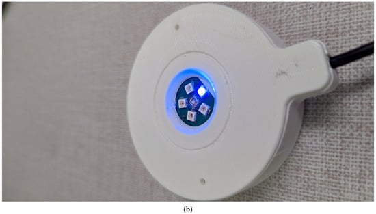 (a) Programmable LED arrays with different colors illuminated; (b) a custom enclosure for field trials in panel traps for CRB, without the attached diffuser (shown with a blue LED illuminated).