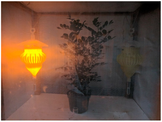 To evaluate artificial lighting for attracting ACP, we placed LED arrays in the “tripod structure” in the top of custom-designed “stem traps” for ACP [8]. The main 3D-printed body of these traps includes an array of 16 curved “stems” that pass through holes into the inside of the trap body, inspired by observations that ACP walk along stems of host plants and hypothetical phototaxis towards the holes in the body due to ambient illumination through the transparent rain skirt at the top of the trap. ACP passing into the inside of the trap eventually falls into a tube of preservative fluid (ethanol in the case of these relatively brief experiments). To evaluate attraction to individual wavelengths, we first conducted forced choice experiments with two identical traps and lighting systems, with the selected LED fully illuminated in one trap and the other trap unlit. In these experiments, 20 freshly caught ACP from a heavily infested mock orange (Murraya paniculata) hedge were released into the middle of a screened cage (approximating a cube with 1 m sides), with traps suspended on either side of a small potted mock orange plant (Figure 2), repeating each forced choice experiment at least three times. Catches in each trap were recorded after two hours, and “attraction” to the given LED was inferred based on binomial probabilities of the observed results, assuming a hypothesis that both traps were equally likely to attract ACP. To confirm the most effective wavelength for enhancing trap catch, we conducted similar binary forced-choice experiments among the three most “attractive” colors identified in preliminary experiments (i.e., forced-choice experiments with two traps illuminated with different color LEDs), releasing 25 freshly caught ACPs in each trial. To evaluate the effect of LED modulation, we conducted similar experiments (again releasing 25 freshly caught ACPs for each trial) with one trap illuminated fully with UV (385 nm version) and a second trap using modulated UV light, either pulsed fully on and off at a given frequency and 50% duty cycle, or with sinusoidal half waves at the same frequency. The modulation frequency (1.4 Hz) was selected corresponding to a characteristic strong peak in the Fast Fourier Transform (FFT) of light measured with a downward-facing photosensor held in a citrus canopy in bright sunlight (Supplementary Materials Figure S3), hypothesizing that these light conditions would be consistent with those that ACPs encounter in their natural habitat.