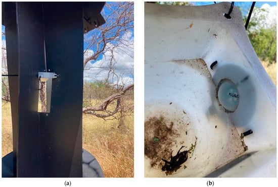 Programmable LED arrays in traps for coconut rhinoceros beetle (Oryctes rhinoceros): (a) deployed in the panel of CRB panel traps; (b) deployed in a cup of CRB panel traps (b).