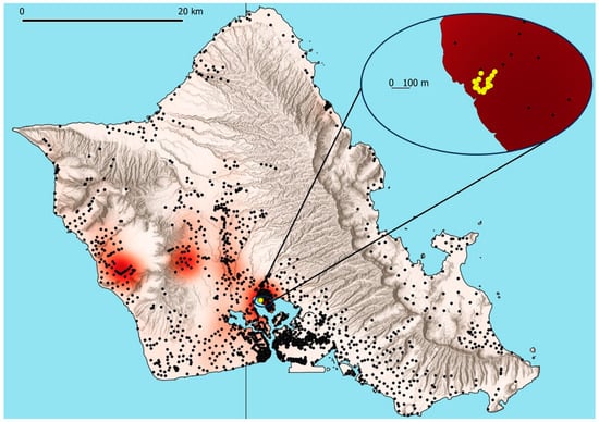 Lighting preference experimental trap locations for coconut rhinoceros beetles (Oryctes rhinoceros) and catch heat map (September–December 2023); the heatmap uses default “red” color ramps with 2.5 km radii on QGIS 3.34 for all geolocated panel trap catches on Oahu in September–December (n = 11,716).
