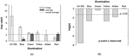Trap catches in forced-choice experiments in stem traps for Asian citrus psyllid (Diaphorina citri): (a) showing results of traps lit with different LED wavelengths against unlit traps; (b) binomial probabilities of observed treatment catch if lighting has no effect.