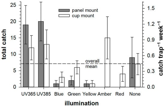 A significant amount of effort has been made to use color and lighting to improve insect trap performance, including through direct evaluation of different color materials, lights, and unique illumination patterns of traps in field trials [8,9,32,33], or through electrophysiological evaluation of insect vision [34,35,36] to craft palettes with spectral reflection or lighting more closely tuned to insect visual experience [14,16,35]. Artificial lighting is prevalently deployed to enhance the capture of insects, especially those active nocturnally, both for general ecological censuses and for IPM. In these scenarios, lighting with a significant UV component generally performs best (i.e., [32,33]). Robertson and Horvath [26] demonstrated that nocturnal aquatic insects are not preferentially attracted to horizontally polarized lamps but generally avoid red and blue light. Kamei et al. [37] observed that white LEDs (with emission bands primarily in the visible spectrum) were less effective for attracting insects than Mercury Vapor fluorescent lighting with strong spectral lines in UV and purple, though for some orders of insects, this difference was mitigated by using white LEDs with a more “cool” (i.e., blue) characteristic. Komatsu et al. [38] deployed lighted insect traps during summers in Northern Japan to determine that some aquatic insects and winged ants were attracted to a broad spectrum (UV-A to green), whereas moths and beetles were more attracted to a narrower spectrum of wavelengths (UV-A to blue). Similarly, Al-Deeb [39] showed that palm-infesting beetles similar to CRB were more attracted to mercury vapor lamps with significant short wavelength radiation than they were to lights with radiation in the longer wavelength visible parts of the spectrum.