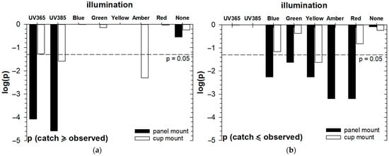 Tests for coconut rhinoceros beetle (Oryctes rhinoceros): (a) “attraction” and (b) “aversion” to different light treatments based on binomial probabilities of total observed catches for each treatment. The results suggest that UV improves trap catch performance for CRB, especially if placed in the panel of traps, and other color LEDs suppress CRB catch if placed in the panel of traps. The observed effects are generally moderated if LEDs are used to illuminate the trap cups.