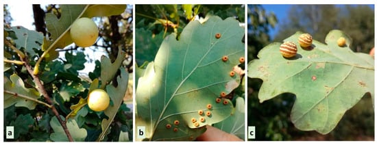 - Jankiewicz, L.S.; Dyki, B.; Machlańska, A.; Dubert, F. Oak leaf galls: Neuroterus numismalis and Cynips quercusfolii, their structure and ultrastructure. Acta Soc. Bot. Pol. 2017, 86, 3537. [Google Scholar] [CrossRef]