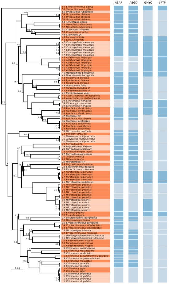 The higher OTU count in ASAP analysis (58) reflected greater subdivisions within the subfamily Chironominae, whereas the ABGD’s 55 OTUs showed fewer divisions within the same subfamily. The GMYC and bPTP analyses identified 29 and 28 OTUs, respectively, with identical delimitations in 24 cases. The ASAP and ABGD analyses exhibited similar delimitations in 52 OTUs. Overall, ASAP produced the highest OTU count, while bPTP reported the lowest.