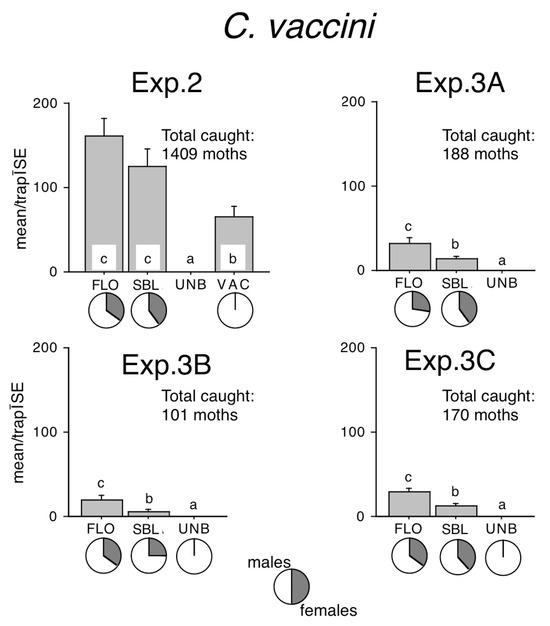 Catches of Conistra vaccinii in traps baited with bisexual lures FLO and SBL, or with the synthetic sex attractant (VAC), and in unbaited traps (UNB). Columns with the same letter within one diagram are not significantly different as determined by a Kruskal–Wallis test and followed by pairwise comparisons by a Mann–Whitney U test (P = 5%). Pie charts under the columns show the sex ratio in the catch.