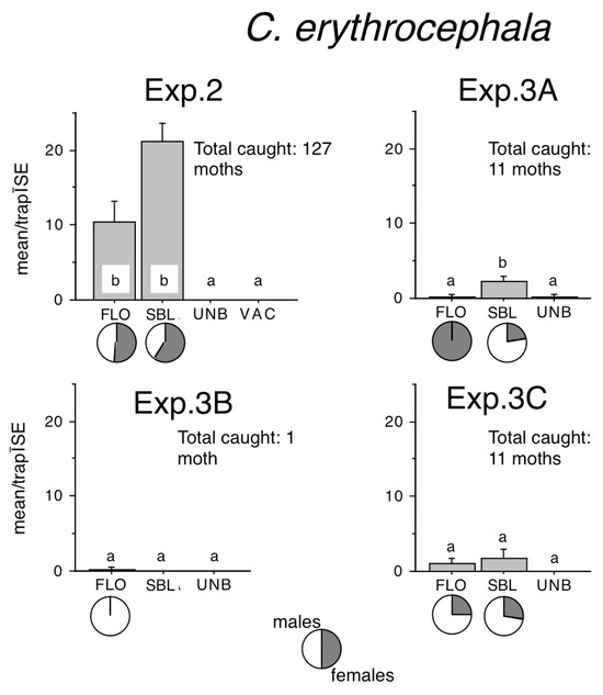 Catches of Conistra erythrocephala in traps baited with bisexual lures FLO and SBL, or with the synthetic sex attractant of Conistra vaccinii (VAC), and in unbaited traps (UNB). Columns with the same letter within one diagram are not significantly different as determined by a Kruskal–Wallis test and followed by pairwise comparisons by a Mann–Whitney U test (P = 5%). Pie charts under the columns show the sex ratio in the catch.