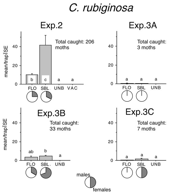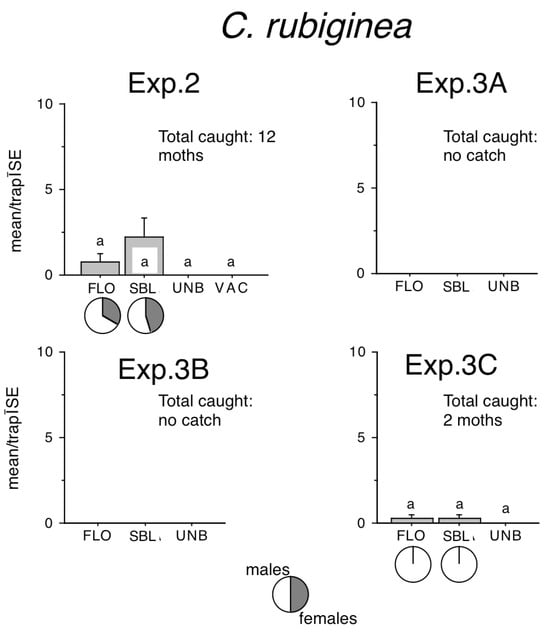 A total of 12 C. rubiginea moths were recorded in Exp. 2, and 2 moths in Exp. 3C (Figure 4) in FLO and SBL–baited traps. No significant difference was found between zero catches of unbaited traps and any other treatments.