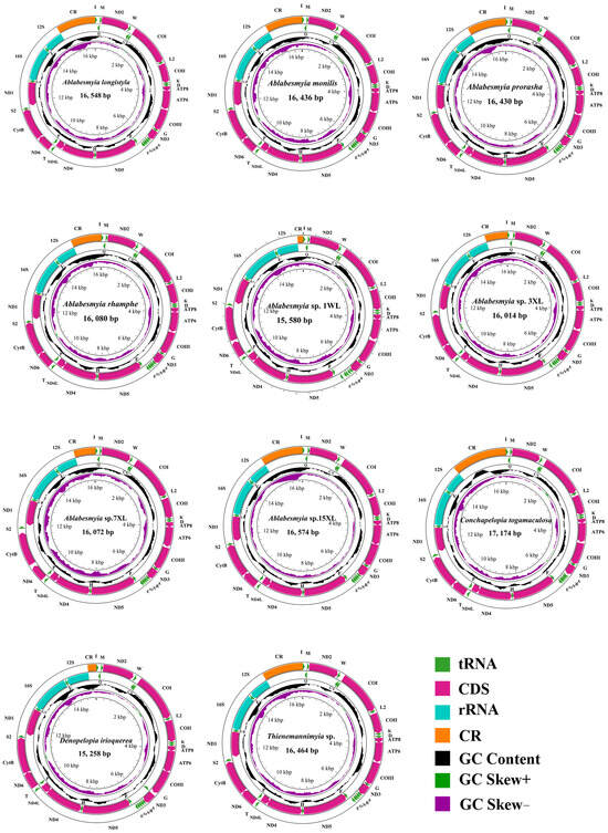 The sequences newly acquired exhibited a range of lengths, varying from 15,258 base pairs (bp) in Denopelopia irioquerea to 17,174 bp in Conchapelopia togamaculosa. The primary factor contributing to this variation was the fluctuating size of the control region (CR), which ranged from 191 bp in Ablabesmyia sp. 1WL to 1959 bp in Ablabesmyia sp. 3XL (Table 2). All of the newly assembled mitogenomes contained a standard complement of genetic elements, consisting of one control region (CR) and 37 genes. Specifically, these genes encompassed 13 protein-coding genes (PCGs), 22 transfer RNAs (tRNAs), and 2 ribosomal RNAs (rRNAs), as depicted in Figure 1. Notably, the lengths of the majority of these newly assembled mitogenomes were comparable to those observed in previously published Chironomidae mitogenomes. The sequence characteristics of the represented species are visually summarized in Figure 1.