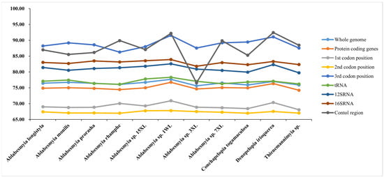 The nucleotide composition of the newly reported mitogenomes demonstrated consistent patterns among the samples, as presented in Table 2, which were characteristic of the AT-bias typical in Chironomidae and other insect lineages. Significant variation was observed in the AT content of the mitochondrial genomes, with values ranging from 74.20% in B. alulasetosa to 78.78% in C. bicinctus (Figure 2 and Table 2). Notably, the control region (CR) exhibited the highest AT content, ranging from 76.57% in A. sp. 3XL to 92.41% in D. irioquerea. In contrast, the AT content in transfer RNAs (tRNAs) and protein-coding genes (PCGs) was relatively lower compared to ribosomal RNAs (rRNAs) (Table 2).