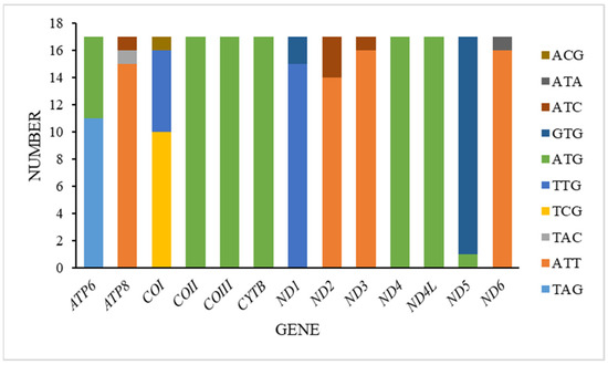 In the mitogenomes we acquired, all thirteen protein-coding genes (PCGs) mostly featured the conventional start codon ATN, aligning closely with the typical mitochondrial start codon observed in insects. However, deviations were noted in other genes. Specifically, the cytochrome oxidase subunit I (COI) gene utilized TCG as its start codon in ten species, TTG in six species, and ACG in one species. The ATP synthase subunit 8 (ATP8) gene began with ATT in fifteen species and ATC in one species, while the ATP synthase subunit 6 (ATP6) gene started with ATG in all species. The NADH dehydrogenase subunit 1 (ND1) gene utilized TTG as its start codon in fifteen species and GTG in two species. Similarly, the NADH dehydrogenase subunit 2 (ND2) gene started with ATT in fourteen species and ATC in three species, and the NADH dehydrogenase subunit 3 (ND3) gene began with ATT in sixteen species and ATC in one species. Furthermore, the cytochrome oxidase subunit 2 (COII), cytochrome oxidase subunit 3 (COIII), cytochrome b (CYTB), NADH dehydrogenase subunit 4 (ND4), and NADH dehydrogenase subunit 4L (ND4L) genes consistently started with ATG. The NADH dehydrogenase subunit 5 (ND5) gene uniquely started with GTG in sixteen species and ATG in one species, while the NADH dehydrogenase subunit 6 (ND6) gene exclusively began with ATT in sixteen species and ATA in one species (Figure 3).