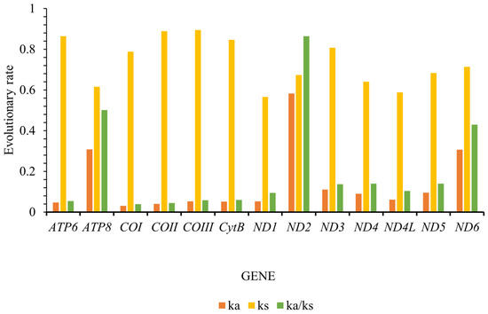 The Ka/Ks ratio, also known as ω, is a widely utilized metric to quantify the rate of sequence evolution in the context of natural selection. Our findings closely mirror those reported for other insect species, demonstrating that the Ka/Ks values for all thirteen protein-coding genes (PCGs) consistently fell below one, with a range spanning from 0.039 for cytochrome oxidase subunit 1 (COI) to 0.864 for NADH dehydrogenase subunit 2 (ND2) (Figure 4). The evolutionary rates of these PCGs can be ordered as follows: ND2 > ATP8 > ND6 > ND4 > ND5 > ND3 > ND4L > ND1 > CYTB > COIII > ATP6 > COII > COI. Our findings notably demonstrate that many of these genes have evolved under purifying selection, which acts to remove harmful mutations and is influenced by varying selective pressures. Specifically, the low ω values observed for COII and COI indicate a stringent selection environment, suggesting strong evolutionary constraints. In contrast, the higher ω values for ND2, ATP8, and ND6 suggest a more relaxed purifying selection pressure, implying that these genes may be evolving with greater freedom (Figure 4). These insights enhance our understanding of the evolutionary dynamics of these PCGs and the role of natural selection in shaping their sequence evolution.