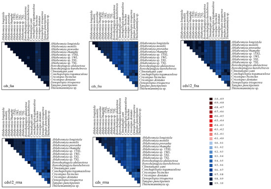 The evaluation of heterogeneity among the mitogenomes of 17 species within the subfamily Tanypodiinae focused on their protein-coding genes (PCGs), amino acid sequences, and ribosomal RNAs (rRNAs). Sequence similarity was visually depicted using colored blocks, based on AliGROOVE scores that range from −1 (indicating significant heterogeneity between datasets, shown in red) to +1 (indicating minimal heterogeneity, shown in blue). A lighter color in each dataset’s block corresponds to greater heterogeneity, while a darker color indicates lower heterogeneity.