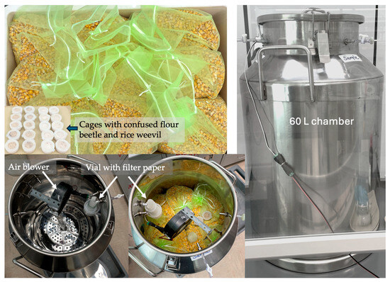 Chlorobenzene fumigations of corn with confused flour beetle and rice weevil were conducted in a 60 L fumigation chamber to demonstrate the efficacy and technical feasibility of large-scale fumigations (Figure 2). The chamber was modified from a 60 L diary pot (38 cm diameter × 62 cm high, 25 cm opening, Eapmic Brand, Amazon.com). A 38 cm diameter round stainless-steel steamer rack was positioned about 7 cm above the bottom to form a raised platform. A 2 cm diameter × 40 cm long plastic tube was positioned vertically with one end fixed to a hole at the center of the platform. A 12Vdc air blower (SparkFun Blower—Squirrel Cage, Sparkfun Electronics, Niwot, CO, USA) was connected to the top end of the tube. Three ports were added on the neck of the diary pot for electricity supply, liquid injection, and gas sampling. A 45 mL Nalgene bottle (Thermo Fisher Scientific, Waltham, MA, USA) with a rolled filter paper disc was positioned below one of the ports to serve as a reservoir for chlorobenzene injected. The bottle was also positioned close to the air inlet side of the air blower.