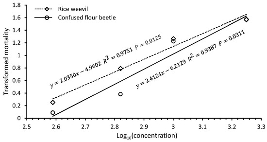 Chlorobenzene fumigation was effective against both confused flour beetles and rice weevils. However, there were also considerable differences among species and life stages in susceptibility to chlorobenzene fumigation. In tests against confused flour beetle and rice weevil adults in jars, the complete control of both species was achieved in 24 h fumigations with 150 μL/L of chlorobenzene. There were significant differences in mortality among different doses for both species (Table 1). At 50 and 100 μL/L doses, confused flour beetle adults had 13.9 and 88.7% mortalities, respectively, and rice weevil adults had 50.8 and 91.1% mortalities, respectively, suggesting that rice weevil adults were more susceptible to chlorobenzene fumigation than confused flour beetle adults (Table 1). The average chlorobenzene vapor concentrations were 388, 660, 1000, and 1775 ppm for the 25, 50, 100, and 150 μL/L doses, respectively. Mortality values transformed by arcsine were highly correlated with logarithms of chlorobenzene vapor concentrations for both confused flour beetle adults ( R2 = 0.9387, p = 0.0311) and rice weevil adults (, R2 = 0.9751, p = 0.0125) (Figure 3). The R2 values are the proportions of mortality variations explained by the equations. The LC95 values of chlorobenzene vapor concentrations were estimated to be 1358 and 1254 ppm for confused flour beetle and rice weevil adults, respectively, based on the regression equations.