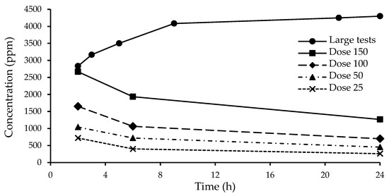 Chlorobenzene vapor concentrations measured with detector tubes at different times in large-scale fumigations with 30 mL of chlorobenzene in a 60 L chamber and in small-scale fumigations in 1.9 L jars with 25, 50, 100, and 150 μL/L doses of chlorobenzene.