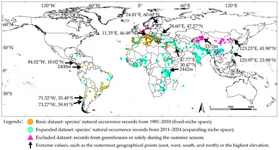 We categorized the collected occurrence records into three datasets. (1) The basic dataset: This dataset represents a fixed-niche space and includes species’ natural occurrence records in 1981–2010, corresponding to the period of CHELSA environmental variables. To ensure a natural representation of the species distribution, records from greenhouses and those restricted to the summer season were excluded. (2) The expanded dataset: Representing an expanding-niche space, this dataset assumed a limited response to climate change in 2011–2024 as T. absoluta continued its global spread. During this period, the species’ habitats did not shift significantly toward higher latitudes or altitudes. The expanded dataset extended the species’ natural occurrence records to include the period from 2011 to 2024, while maintaining the exclusion of greenhouse and summer-only records. (3) The excluded dataset: This dataset retained records from greenhouses and summer-only occurrences separately for further analysis of non-climatic factors, specifically the role of anthropogenic drivers in the species’ rapid expansion.